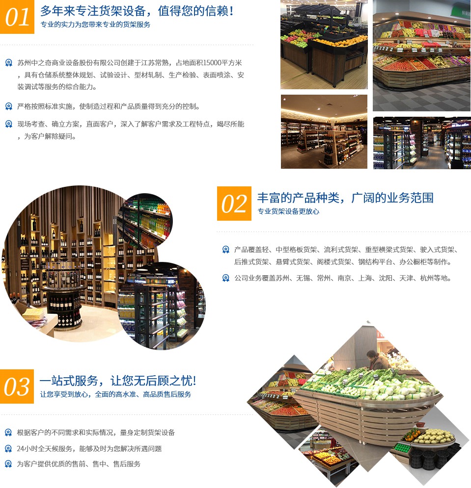 蘇州中之奇商業設備股份有限公司創建于2008年,是一家專注于貨(展)架研發、設計、銷售、生產、安裝服務于一體,為各具特色的連鎖品牌全天候便利店和大中型超市以及百貨等商場的商品展示提供創意和系統性解決方案的企業。公司擁有較強大的專業生產和提供商超貨(展)架、商超配件、商超木制品、新一代商超潮流精品超市和商超不銹鋼制品為主導、相關系列設施為配套的能力。公司還建有各種類型的商超貨(展)架實景樣板間。